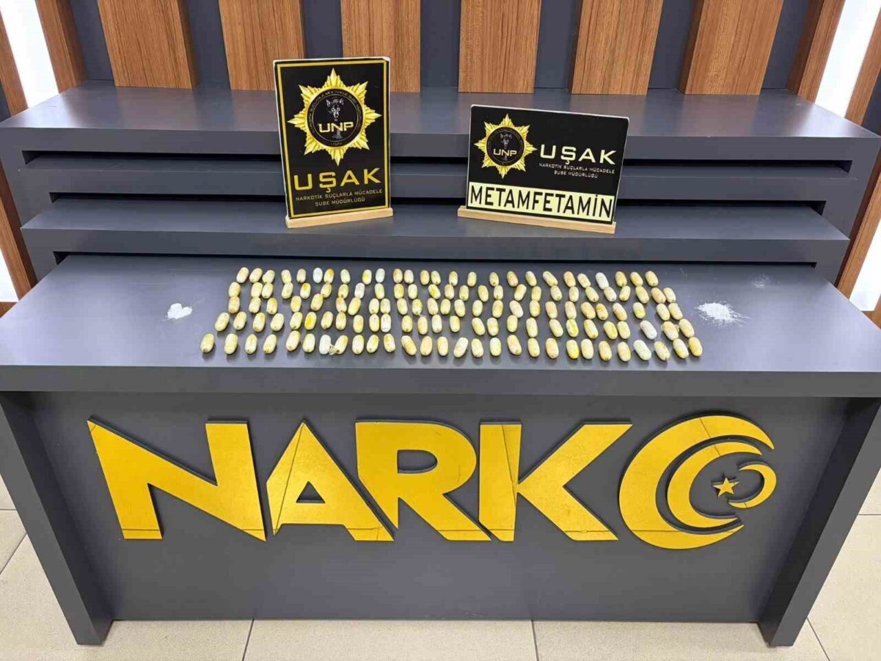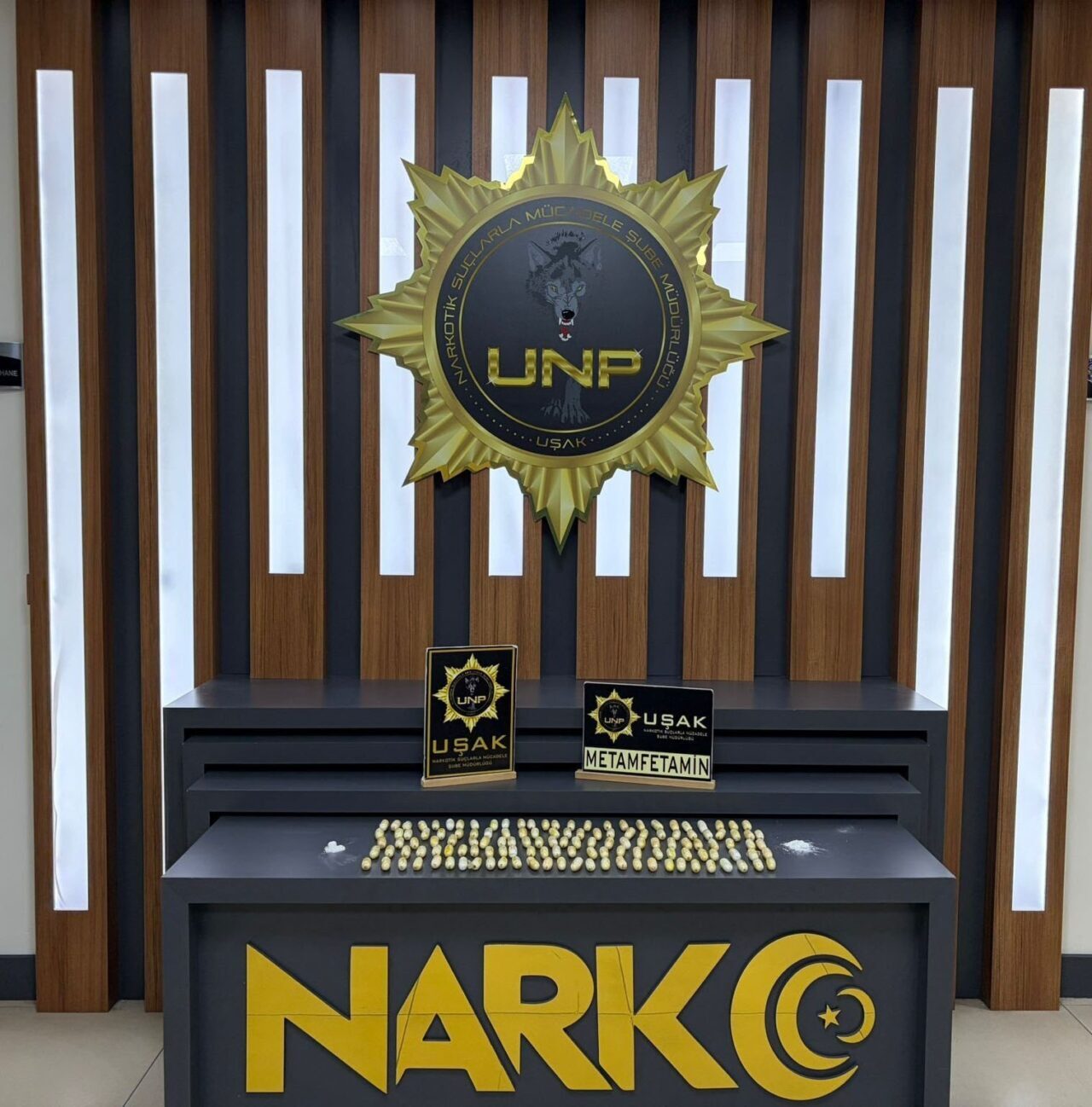 **Uşak’ta uyuşturucu madde ticaretine yönelik yürütülen çalışmalar** kapsamında, İran uyruklu A.S.Z. isimli şüphelinin midesinden yüklü miktarda metamfetamin ele geçirildi.