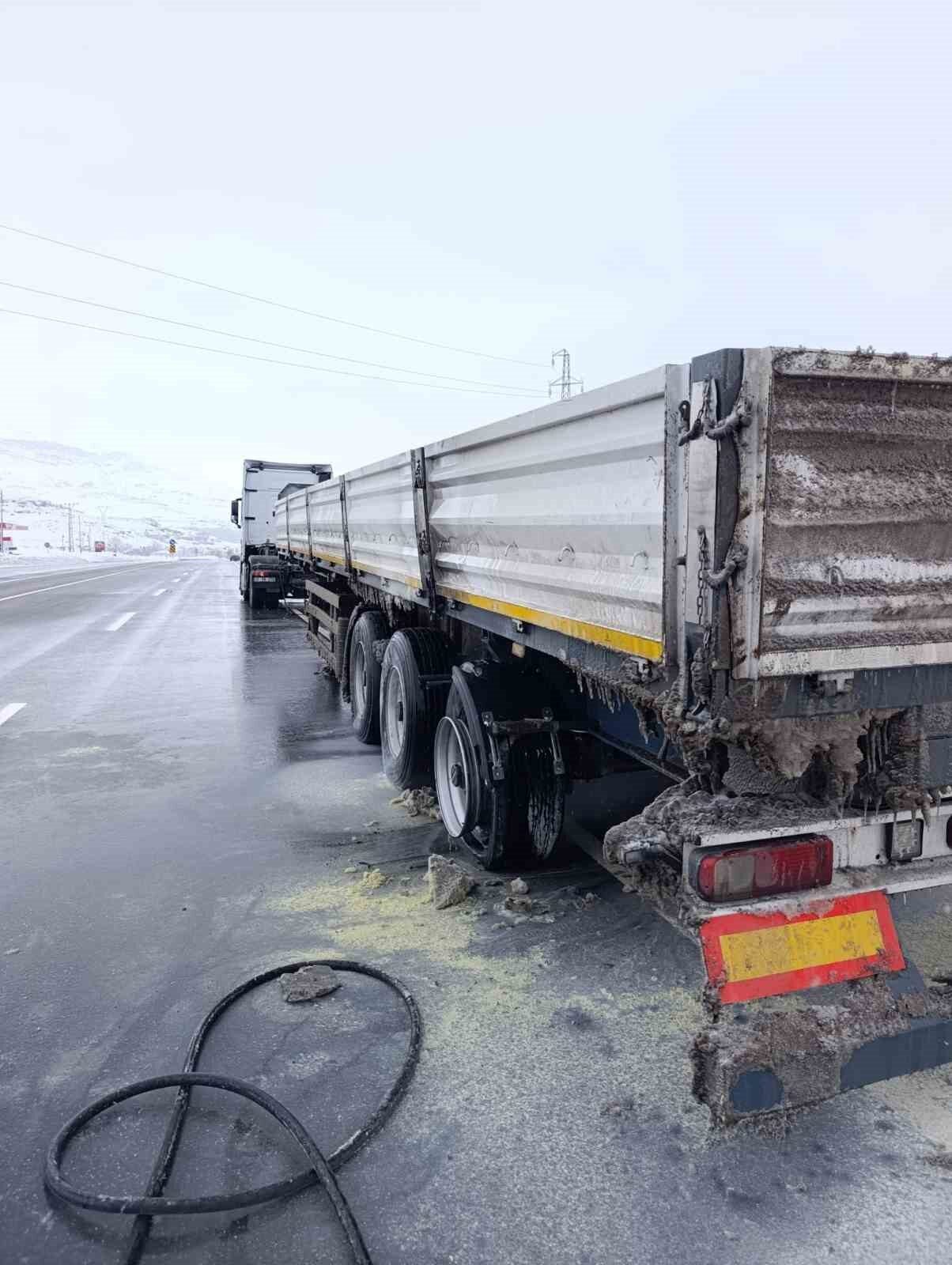 Van-Erciş kara yolunda seyir halindeki tırın lastikleri yandı