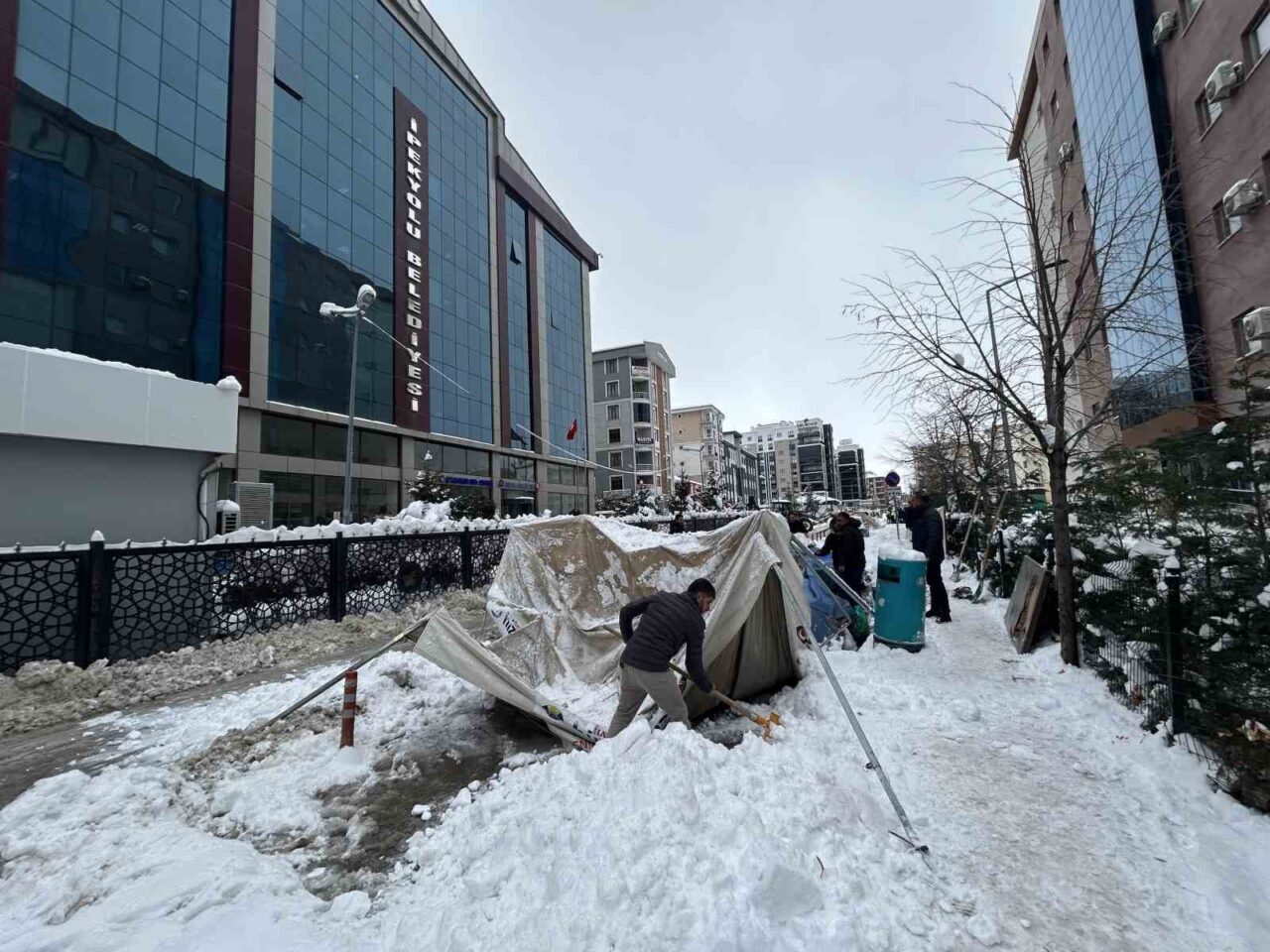 Van’da DEM Partili belediyeler tarafından işten çıkarılan işçilerin İpekyolu Belediyesi önünde kurmuş oldukları eylem çadırı, yoğun kar yağışının ardından çökmüştür.