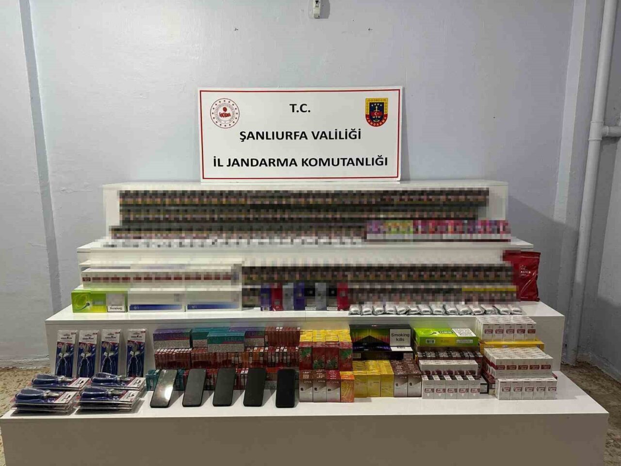 Şanlıurfa’nın Viranşehir ilçesinde jandarma ekipleri tarafından yapılan çalışmalarda çok sayıda gümrük kaçağı sigara, elektronik sigara, telefon, tütün, alkol ve çay ele geçirildi.