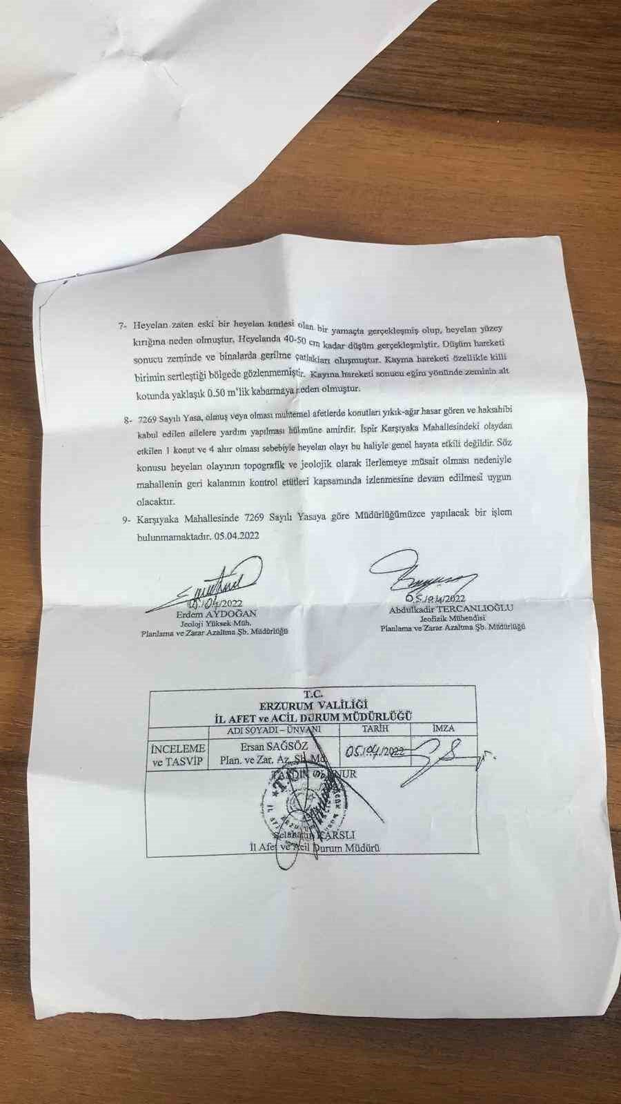 İLÇE MERKEZİNDE İSPİR BELEDİYESİNİN YAPTIĞI 70 METRE UZUNLUĞUNDA 10 METRE GENİŞLİĞİNDE 6 METRE DERİNLİĞİNDEKİ KAZININ ARDINDAN YAŞANAN HEYELAN NEDENİYLE BÖLGEDE 70 EV TAHLİYE EDİLMİŞTİ.