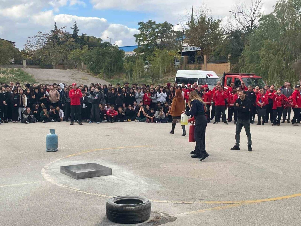Okul bahçesine toplanan öğrenciler, burada da yangın söndürme tatbikatı gerçekleştirildi. Ankara Büyükşehir İtfaiye ekipleri, öğrencilere yangın anında yapılması gerekenleri anlattı ve tatbikatın nasıl yapılması gerektiği üzerine pratik bilgi verdi.
