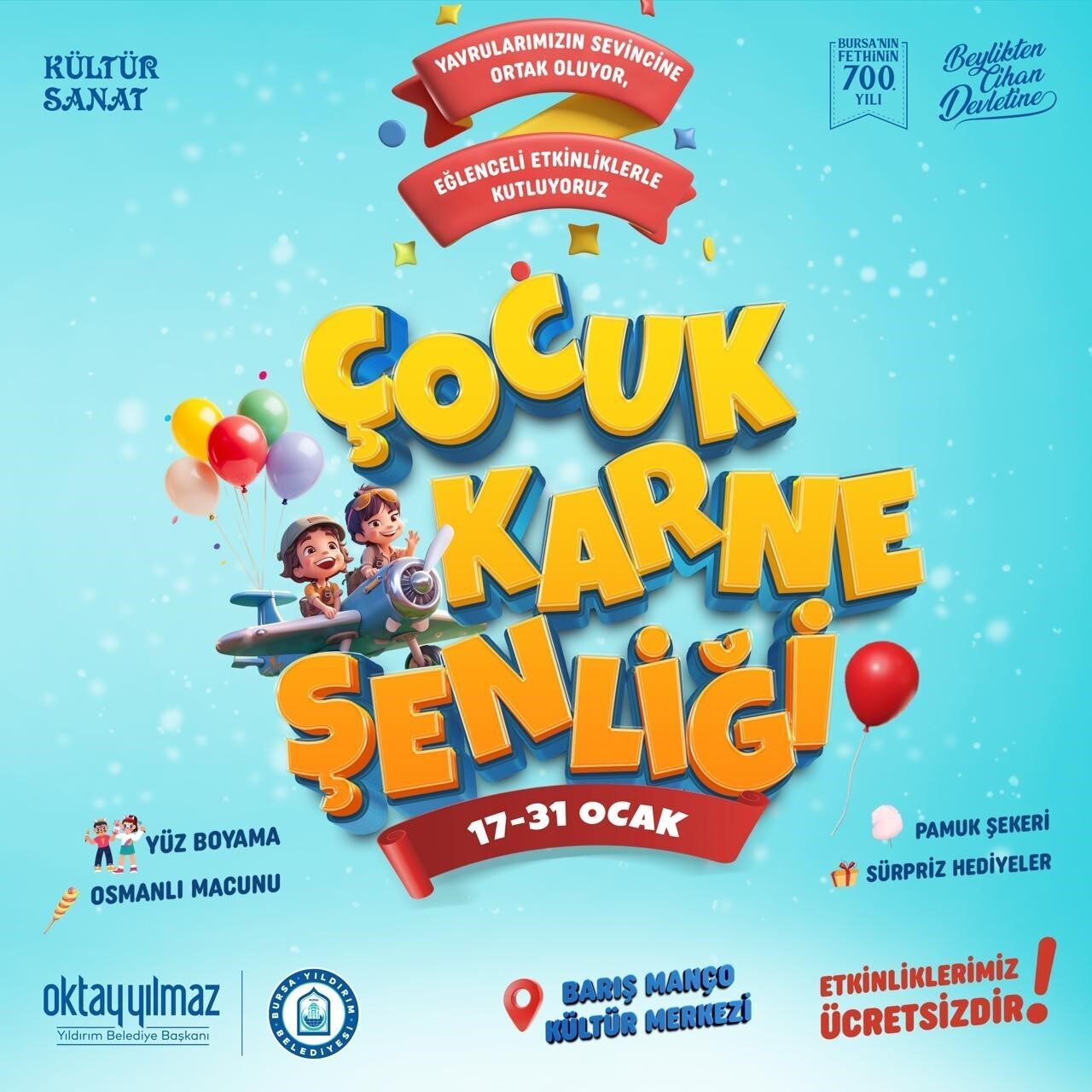 Yıldırım Belediyesi Kültür Sanat ve Sosyal İşler Müdürlüğü tarafından düzenlenen Karne Şenliği, 17-31 Ocak tarihleri arasında Barış Manço Kültür Merkezi’nde gerçekleştirilecek. Şenlik kapsamında çocuklar için birbirinden eğlenceli etkinlikler ücretsiz olarak sunulacak.