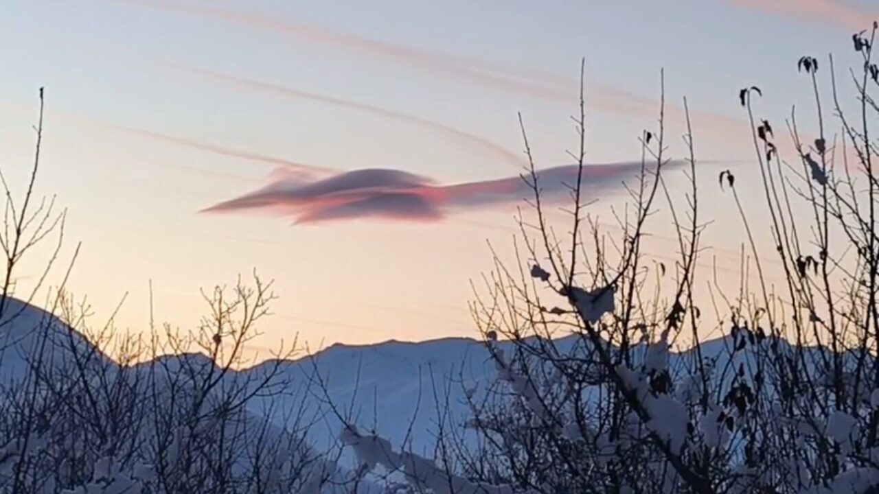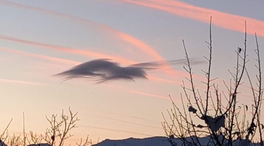 Yüksekova ilçesine bağlı Armutdüzü köyünde akşam saatlerinde gökyüzünde oluşan nadir bir doğa olayı, mahalle sakinlerine görsel şölen sundu. Gün batımı kızıllığıyla birleşen soğuk hava ve sert rüzgar, bir bulut kütlesini adeta canlı bir heykele dönüştürdü.