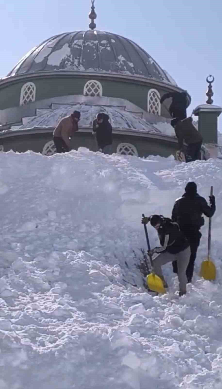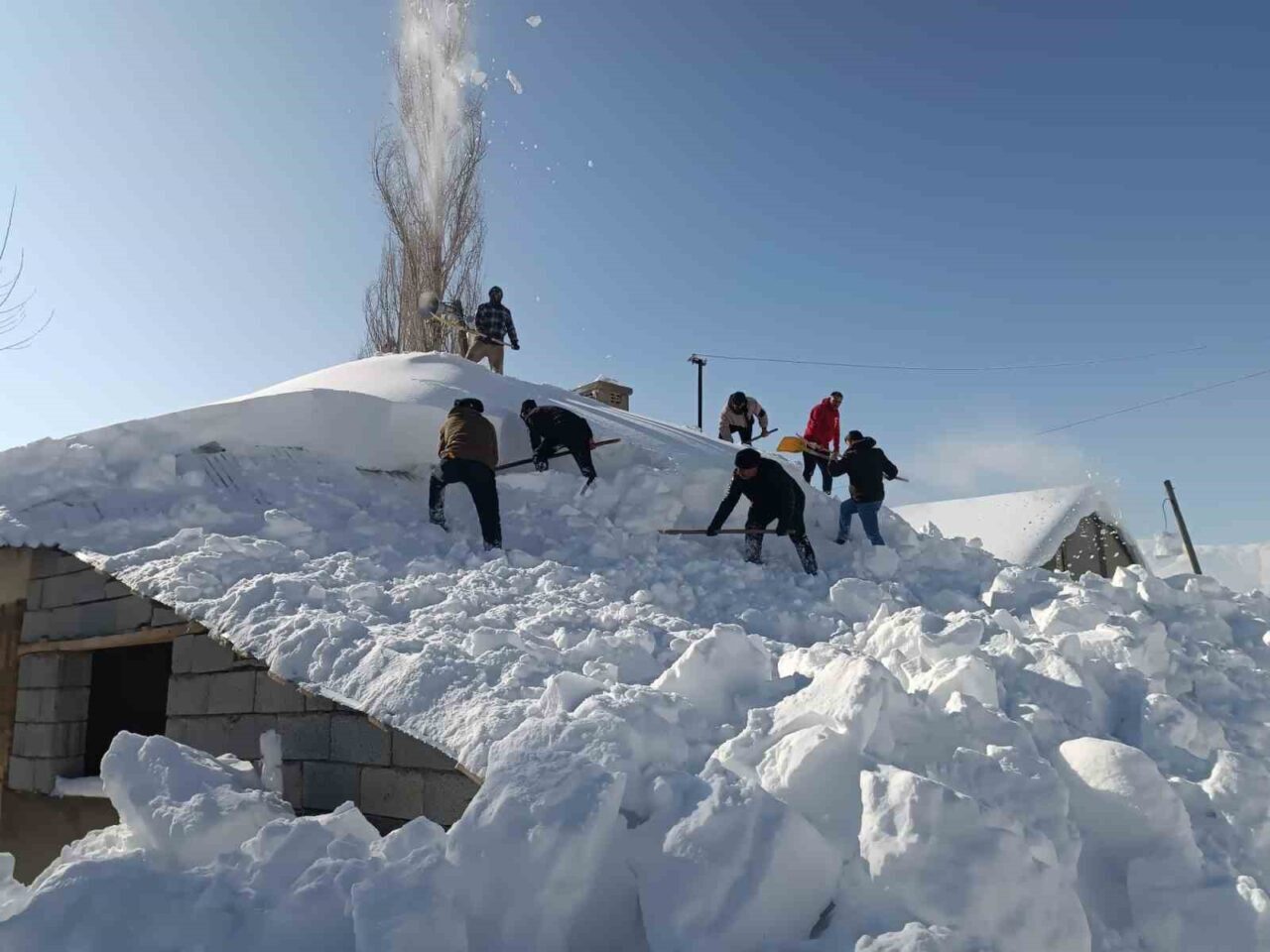 Hakkari’nin Yüksekova ilçesinde yoğun kar yağışının ardından karla kaplanan cami ve evlerin damları köy sakinlerince imece usulü temizlendi.