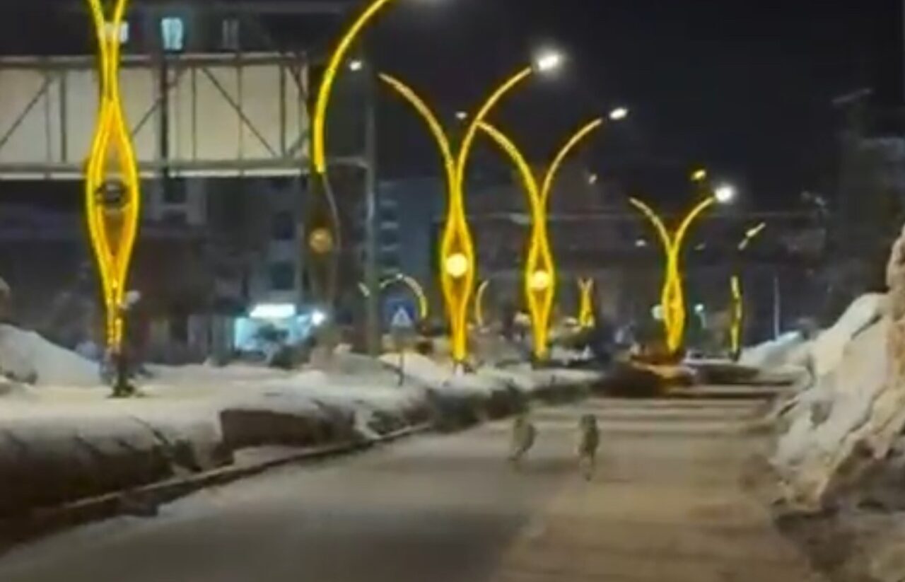 Hakkari’nin Yüksekova ilçesinde etkili olan olumsuz hava koşulları sebebiyle yiyecek bulamayan kurtlar, yiyecek arayışı için ilçe merkezine inmeye başladı.