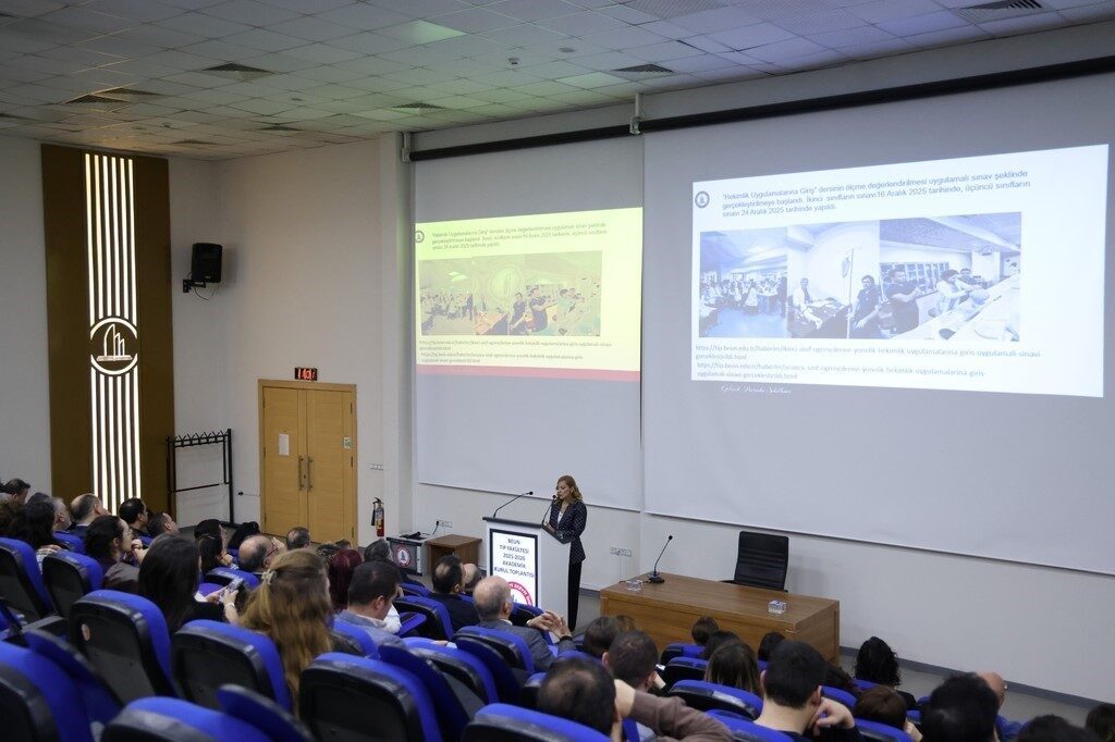 Toplantının açılışında konuşan Tıp Fakültesi Dekanı Prof. Dr. Hande Aydemir, 2024-2025 Akademik Yılı’nda gerçekleştirilen faaliyetlere ilişkin kapsamlı bir sunum yaptı. Prof. Dr. Aydemir; 2025-2026 Akademik Yılı’na yönelik planlanan çalışmalar, yeni akademik yıl planlaması, akademik ve idari personel ile öğrenci sayıları, fakültede tamamlanan ve devam eden bilimsel, sosyal ve akademik projeler hakkında detaylı bilgiler paylaştı. Sunumunda ayrıca faaliyete geçirilmesi planlanan akademik projeler ile öğrencilere yönelik sosyal, kültürel ve toplumsal etkinliklerden de bahseden Prof. Dr. Aydemir, Tıp Fakültesinin gelişimine verdiği destekler sebebiyle BEUN Rektörü Prof. Dr. İsmail Hakkı Özölçer’e teşekkürlerini sunarak konuşmasını sonlandırdı.