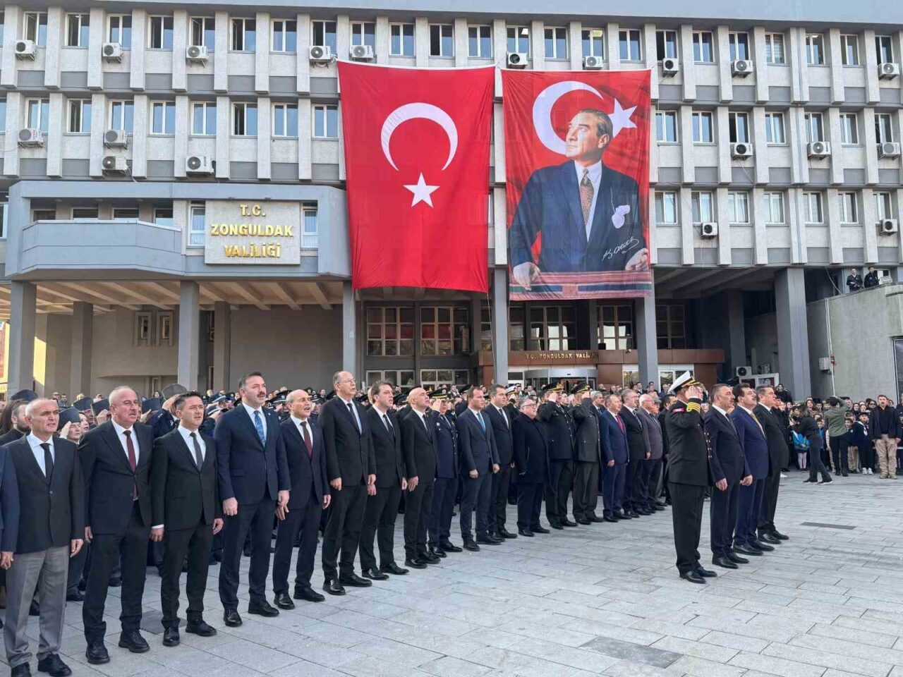 Törenin başlangıcında Atatürk Anıtı’na çelenk bırakıldı. Saat 09:05’i gösterdiğinde sirenlerin çalmasıyla iki dakikalık saygı duruşu gerçekleştirildi. AFAD tarafından organize edilen sistem sayesinde Zonguldak’ın tüm mahallelerinde sirenler çaldı ve cadde ile sokaklarda yer alan vatandaşlar saygı duruşuna katıldı. İş yerlerinde çalışanlar ve araç sürücüleri de bu anlamlı anın bir parçası oldu. Törenin son kısmında ise İstiklal Marşı okundu.
